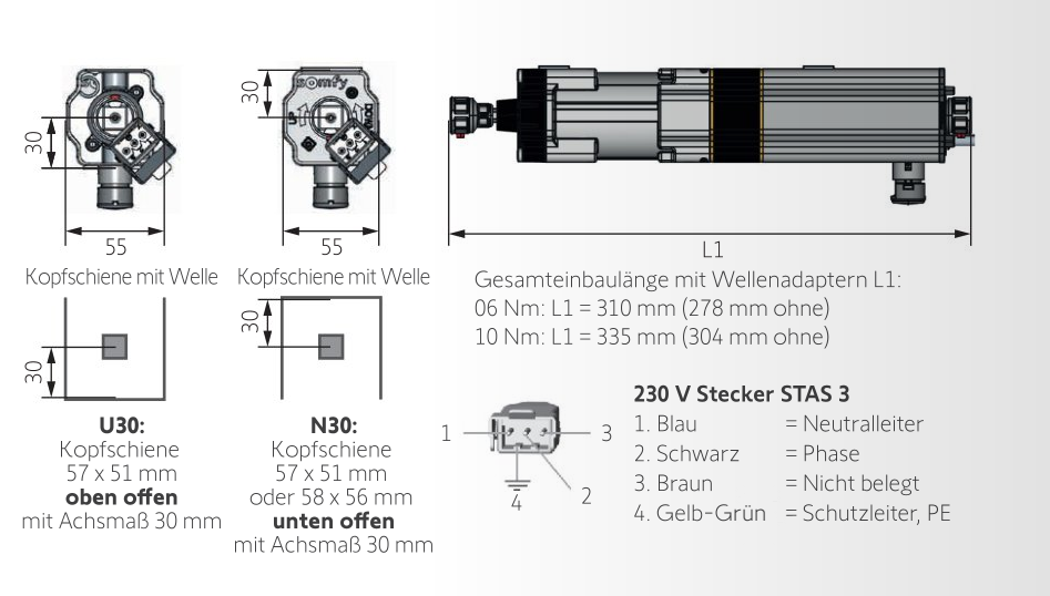 Die U30 Kits eignen sich für Systeme mit Kopfschiene oben offen mit Wendelager-Achsmaß 30 mm und sind zusätzlich mit einer verschraubten Kabelführung ausgestattet.